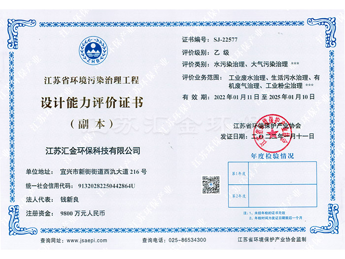 江蘇省環(huán)境污染治理工程設(shè)計能力評價證書
