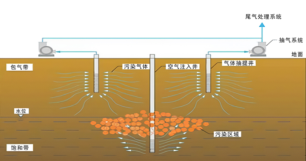 對(duì)土壤揮發(fā)性有機(jī)污染進(jìn)行原位修復(fù)的一種方法,利用真空泵抽提產(chǎn)生負(fù)壓,強(qiáng)制新鮮空氣流經(jīng)污染區(qū)域,將揮發(fā)性有機(jī)物和半揮發(fā)性有機(jī)物從不飽和土壤中隨空氣抽取到地面進(jìn)行收集和處理。主要應(yīng)用于VOCs、燃料油的土壤污染,具有設(shè)備簡(jiǎn)單,易于安裝操作,環(huán)境破壞小,修復(fù)時(shí)間短等特點(diǎn)。